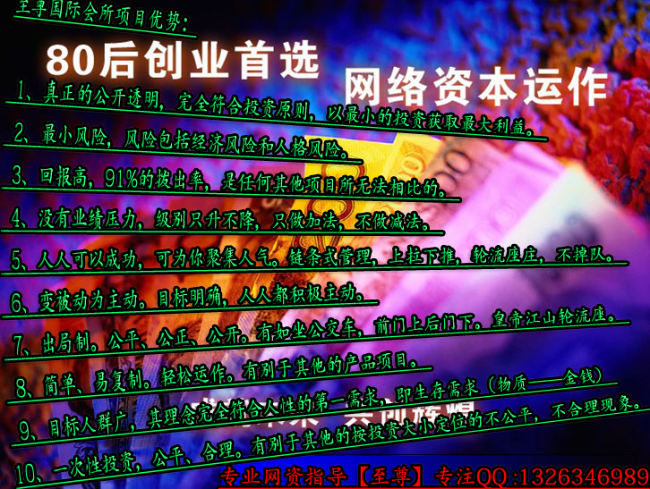 它的核心理念,就是把零散的资金集中起来,按照一定的比例,进行重新分配,让一部分人快速富起来,让绝大多数人挣到钱。是讫今为止,管理最先进、奖金分配最高,风险最小,合作最人性化的一种投资理财模式。投资理财的模式很多,如购买分红型保险,买卖股票、基金、期货、外汇,银行存款等,我们采取的互助式纯资本运作模式,只是方式方法不同,主体不同,本质上完全一样。网络資本的运作:灵活、方便、快捷、透明度高、投入少,风险小,回报高,可全职可兼职,不管在那只要你能上网就能操作,秒结算、当天提现、无沉淀。二十一世纪是信息的时代谁掌握了信息谁就掌握了财富,选择永远大于努力!