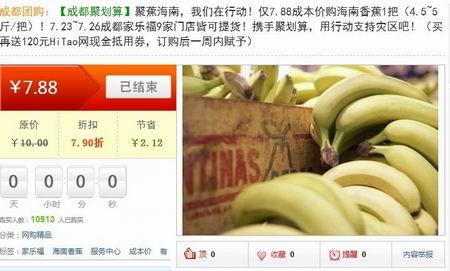 7月15日起,家乐福在团购网上发起了以7.88的特价团购一把香蕉(4.5-5斤/把)的活动,此次活动在成都举行。在参与团购后,市民们可就近选择成都家乐福9家门店中任意一家提货。此次活动吸引了众多成都市民参与,网友对这次团购到的质优价廉的香蕉表示了肯定。