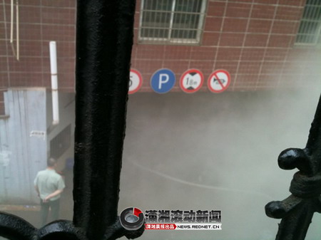 记者在现场看到,消防队员正戴着防毒面具近距离观察地下仓库起火情况,消防车辆已连接好紧急消防水管正往地下仓库入口处喷水灭火。