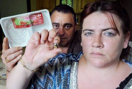 据外电报道,昂热一家家乐福超市出售的碎牛排里居然吃出了一颗两厘米长的人牙,上面还带着金属牙冠。这些标明“100%精肉”的冷冻碎牛排是从家乐福昂热Grand Maine超市买来的。