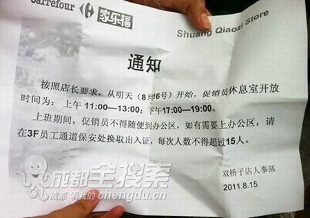 原来,近一个月双桥子家乐福新上任了一名店长,人事部昨晚在员工休息区贴了一张通知,对卖场内的促销人员的作息时间给予了明确规定。