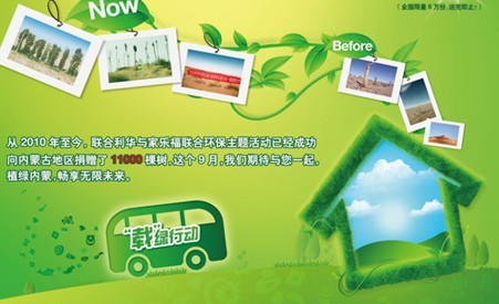 一直以来,家乐福和联合利华都十分重视绿色环保理念,一直行使着自己的责任,为防止土地沙漠化,还世界一片绿贡献自己的力量。自2010年,家乐福与联合利华已经成功向内蒙古地区捐赠11000棵树,飞播造林,点点成茵。