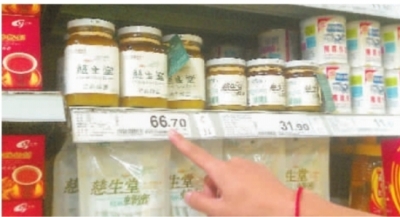 20日上午10时许,记者来到易女士购买蜂蜜的芙蓉广场家乐福店。在该店负一楼靠中间的卖场位置,记者发现了易女士所买类型的慈生堂蜂蜜,400克的标价是66.7元,180克的是31.9元。而其他品牌的蜂蜜价格相对却比较低,同等重量下维持在30元左右。