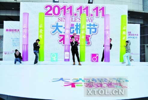 2011年11月11日,共有六个“1”,难得一见的“世纪大光棍节”,也被网友戏称为“神棍节”。充满活力的时尚莲城自然少不了有迎接节日活动。10日,位于建设路口的步步高广场前坪立起六根“神棍”,贴着“求闪婚”、“求爱情”等标签,引得单身男女纷纷拍照留影。 (来源:湘潭晚报 记者:武慧)