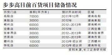 第三,公司2009年底至2010年合计新开4家百货门店(包括步步高广场,衡阳店,永州店以及江西新余店),合计面积约为23万平方米,百货的经营规模扩大超过50%;2011年新开长沙河西店及岳阳店,且百货项目储备充足,未来几年百货业务仍将保持较高的扩张速度。