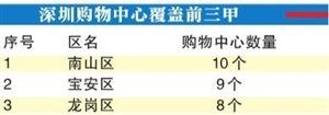 深圳市零售商业行业协会负责人称,目前的深圳7个行政区域已有购物中心覆盖,尚未有购物中心的地区包括坪山、大鹏和光明。
