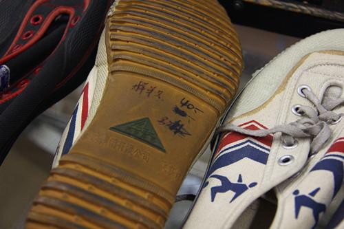 柜台上摆了20多年的飞跃样鞋,另一只早已不见踪影。鞋底的标价一改再改,20、24、30都被圆珠笔划改。这只样鞋被无数顾客拿起又放下,最终停留在了40元时代。千龙网记者 包萌 摄