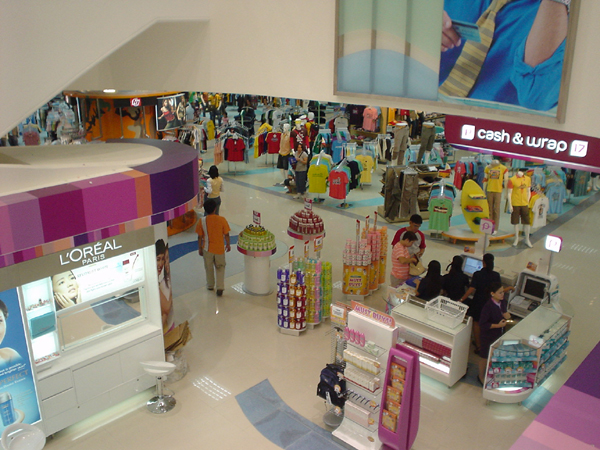 东南亚的许多百货的收银台有2到3台电脑收银机,同时负责打包和包装服务,包装后商品直接拿走不用回柜台(看上图),和超市很象,估计欧美百货业这样?