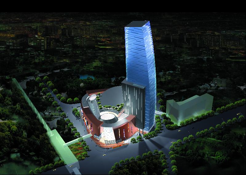 地面裙房由一至九层的购物中心和十至十一层的酒店宴会大厅组成。购物中心标准层呈弧形,有条形中庭及两侧的购物廊道连接三个顶角的椭圆形中庭,形成弧形环通的室内购物街。在购物街围合的中心区域是每层三千平方米左右的百货公司,百货公司向三个椭圆中庭都开有入口。购物中心八层沿中庭四周为大型的美食广场。八,九层是大型书城,十层是酒店宴会大厅。如此齐全的设施,再加上十分便捷的交通,必将带动整个地区的经济繁荣。