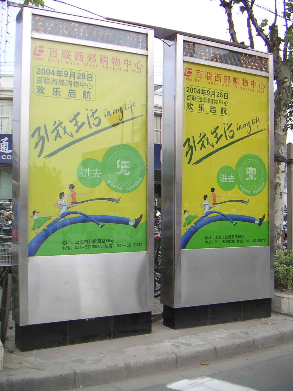 百联西郊购物中心试营业阶段——整合营销传播备忘(部分) 项目三):主题卡通形象——长腿家庭 设计说明:我们运用卡通的夸张手法设计了长腿的形象元素,增加了视觉冲击力的作品在使用中吸引大众的眼球,长长伸向前方的长腿即丰富了画面又有指向性,很好的做到了广告大师伯恩巴克所提出的优秀设计的三点元素:1、准确2、简约3、戏剧性(夸张)。 作为设计公司,万马堂在现场工作的同时组织了员工进行了小规模的调查,调查结果表明,视觉受众可以接受主题的卡通形象,在调查时群众表达了对卡通形象以及充气长腿卡通人物的喜爱和好奇。 项目四):户外平面广告统一风格设计 包括:灯箱、刀旗、吊旗 设计说明:购物中心现场的主题统一风格,使消费者和生活者(百联特有的定位)完全沉浸在整体的生活欢乐气氛之中。进去兜!——这句幽默简练的语言已经成了购物观光居民的口头语。起到了很好的宣传作用。