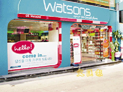 和黃(0013)旗下屈臣氏集團與韓國GSRetail(前身LG Mart)持股各半之合資公司GS-Watsons宣布,首間位於韓國的屈臣氏個人護理店已於本月3日在Hong-Ik大學區啟業,標誌屈臣氏正式打入韓國市場。