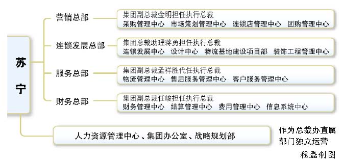 《每日经济新闻》从苏宁方面了解到,在苏宁原先的三级矩阵式管理体系中,其最上一级为十四大管理中心,而在此次会议上,苏宁对总部工作职能关联度较大的各大中心进行了重新整合,在总裁办统一管理的基础上又形成了四大管理总部:营销总部、连锁发展总部、服务总部和财务总部,以加强苏宁总部的管理力量和能力。