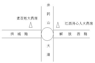 这里的十字型交通要道与别处不同的是架设了四环高架立交桥,虽然人们从这里可以到达南昌八一大道、火车站等,但是途经的顾客很大一部分将因为凌空而建的高架桥而无法到地面的药店观瞻或购物。此外,人们从桥上能看到的老百姓大药房的广告牌非常抢眼,开心人大药房的招牌则显得隐蔽、低调。