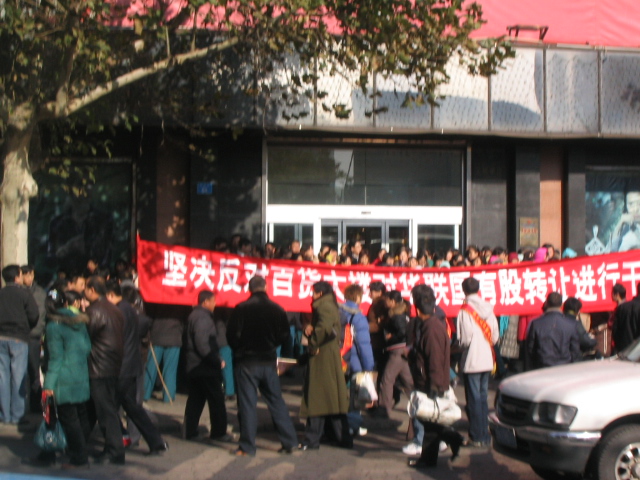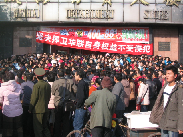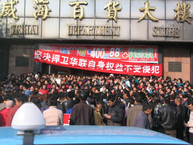 转自威海本地网:2006年12月3日上午9时左右,威海华联数百名职工齐喊口号,手持条幅,封堵威海百货大楼三个大门,时间长达3小时之久。