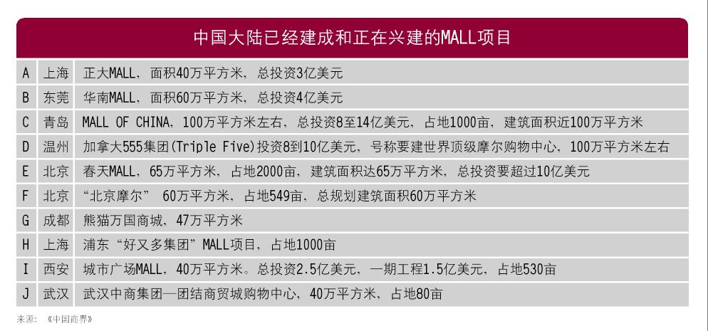 在中国大陆的经济发达地区,造MALL运动正在兴起。在这些已经建成或者正在建造的MALL当中,绝大多数位于城市中心。目前,在中国大陆已经建成和正在兴建的MALL项目有:
