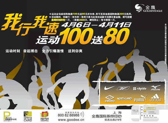 运动全场单柜购物满100元送80元折扣券,即可至其他楼层购物满200元抵用。