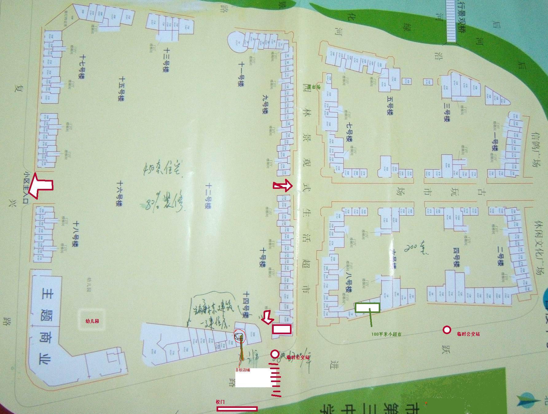 从图上看不出来,要标示出小区的围墙在哪里? 人们主要可以从哪里进出,另外临街附近的交通设施需要标注,主要人流的走向,周边商铺的定位