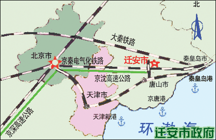 迁安地处环京津一级经济开发区内,地理位置优越,交通运输便利。北倚燕山、南望渤海、东连东三省、西临京津唐。分别距北京、天津195公里。距离三大港口京唐港80公里、秦皇岛港75公里、天津新港120公里。距首都机场195公里、天津机场160公里、山海关机场100公里。均有高速公路连接。500公里配送服务半径以内覆盖沈阳、长春、济南、石家庄等大中城市。