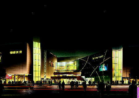 【空间造型】通过有机的形体组合,结合功能与空间形态,形成简洁明快的建筑形象。A区的银泰百货主力店部分以实墙和广告为主,稳重简洁大方。B区为休闲及辅助业态,根据功能布置设计了部分玻璃,与入口广场、城市空间、观光电梯、大型电子显示屏相结合,形成一个丰富又大气的商业中心、视觉中心,充分体现城市MALL的个性。