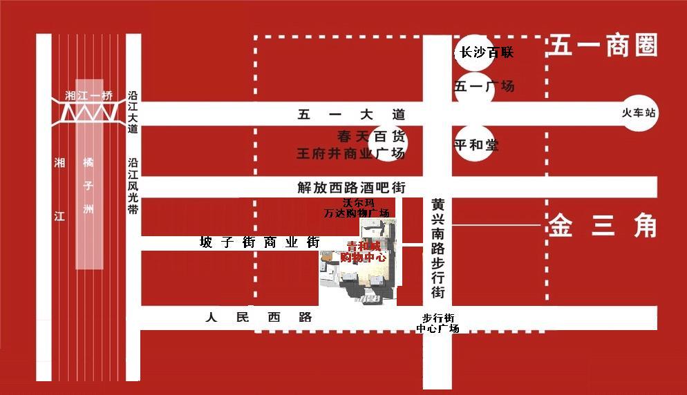 青和城(KingHall)(长沙)购物中心(坡子街国际版中华商街项目的子项目,位于坡子街东入口处,由3个地块(5、6、7号地块)融合而成,北依长沙万达商业广场(沃尔玛位于其二、三层),南临人民西路;东依黄兴路步行街,西临坡子街商业街。地理位置十分显要,是经商投资的黄金地段。项目包括商业设施、高层公寓及会所。总建筑面积约140000平方米,商业建筑面积约80000平方米,地下车库建筑面积约20000平方米,公寓建筑面积约40000平方米。目前正处于项目的工程建设、商业规划调整阶段。青和城购物中心是长沙第一个全新概念的shoppingmall操作,旨在构造一个娱乐休闲式开放的购物中心,错落分布餐饮、休闲、娱乐、购物等多种业态,最终实现项目“一站式休闲娱乐”、“休闲中购物”,利用商业的运作推动全新的长沙人娱乐购物生活模式。