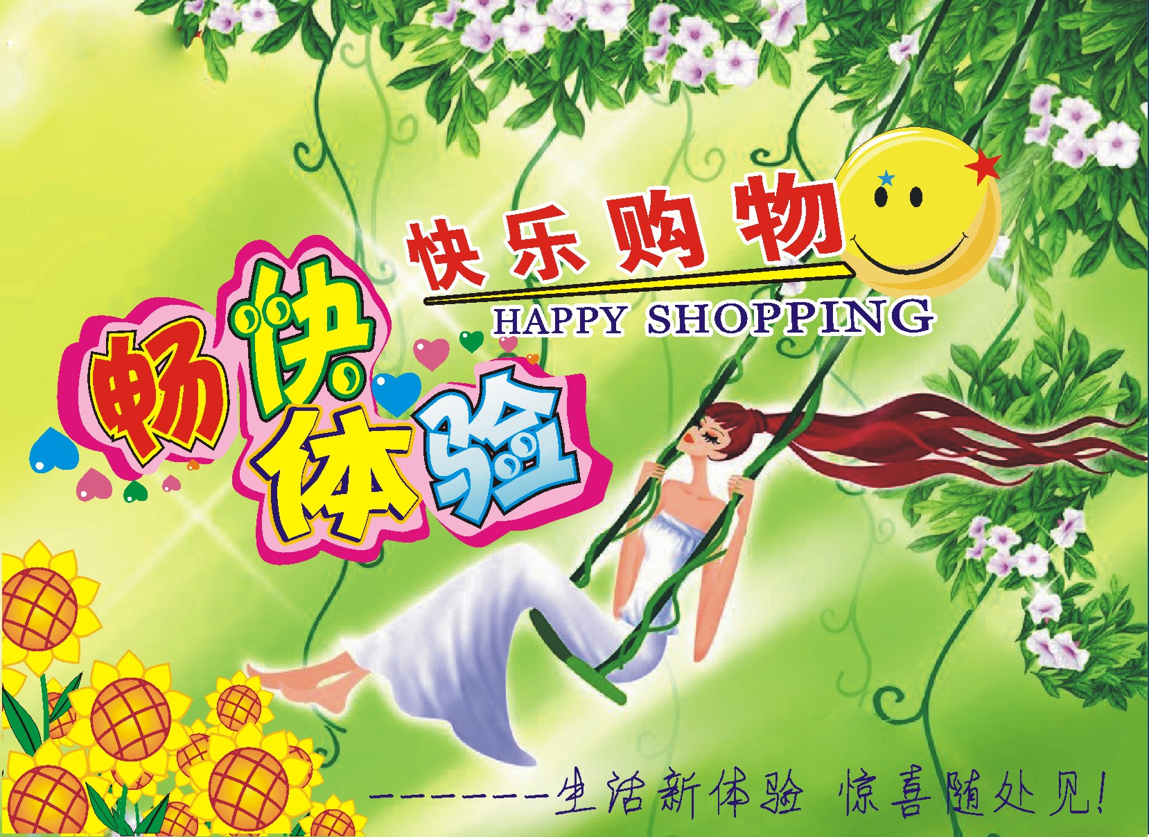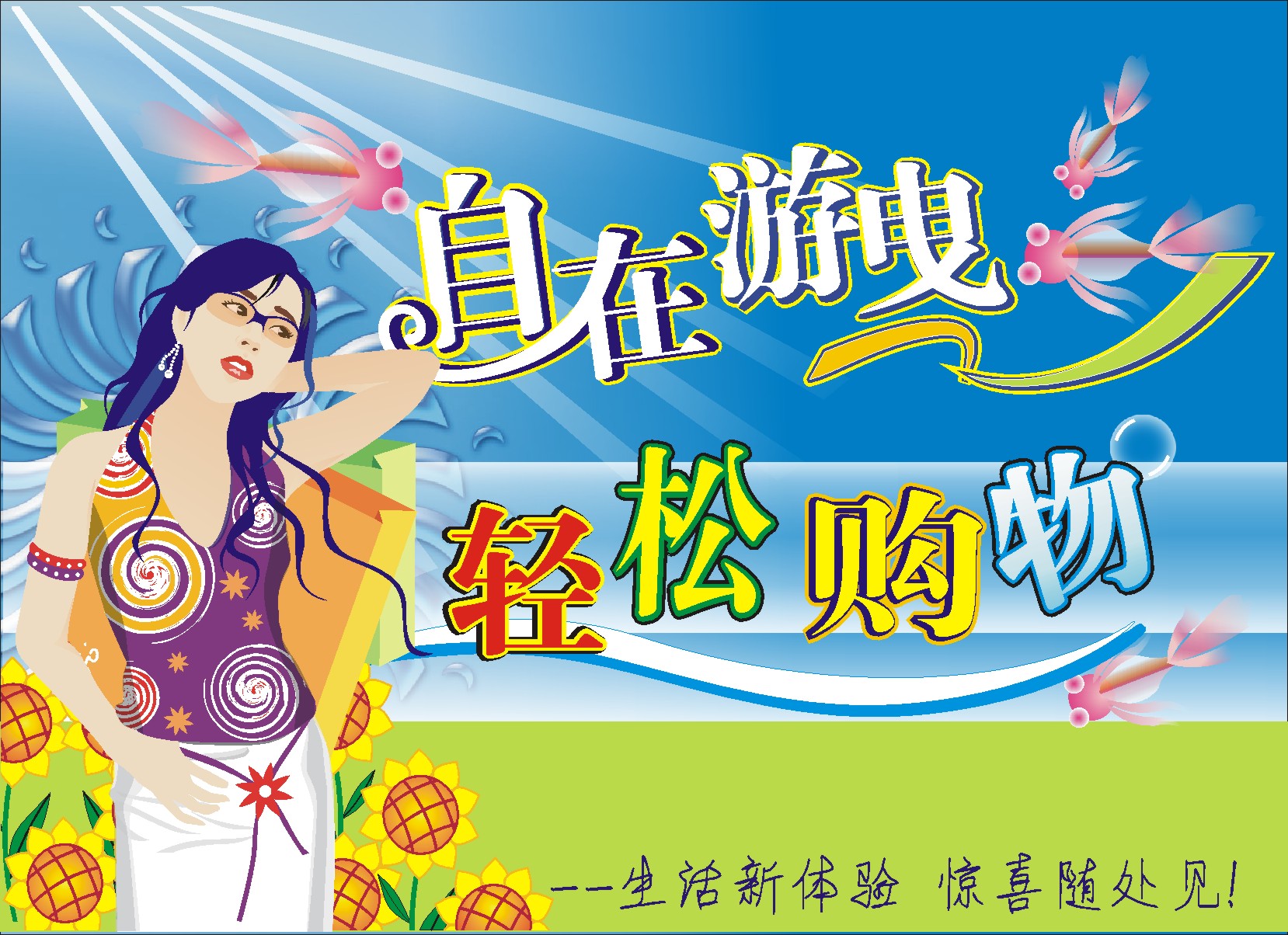 吊旗用了太多的颜色,感觉比较乱(又是海有是金鱼又向日葵,素材搭配不合理)