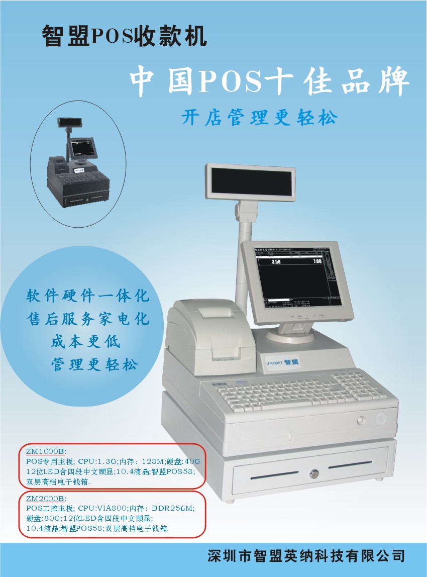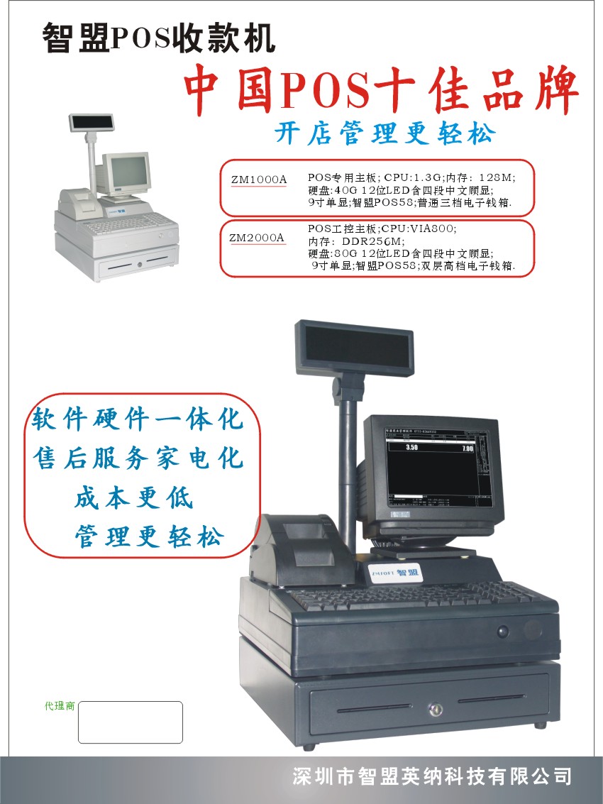 开发与销售POS收款机与智盟经营圣手系列商业POS系统,适应于大型连锁配送心,购物广场,百货,中小型超市,文具书店, 便利店、专卖店、化妆品店,食品店、冲印店,烟酒店,餐饮店、服装店,球场管理、医药店、加油站、批发管理等各种消费零售商店与批发.进销存软件诚征全国各地总代理.周边设备:条码扫描枪(激光.红光).POS六件套.POS58小票机.总部联系电话:13632519167,金小姐,期待您的加盟….(POS收银机.POS收款机.超市设备.超市软件.餐饮设备.热敏打印机.扫描枪.条码打印机.票据打印机.药店软件.服装软件.餐饮软件.)QQ:164281792 MSN:jinglin163com@hotmail.com 网站:www.zmpos.com