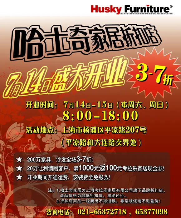 本周六(7月14日),考拉乐家居位于杨浦区平凉路207号(平凉路与大连路交界处)“哈士奇家居折扣店”将盛大开业。