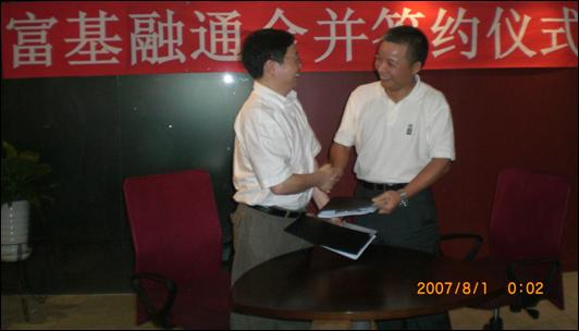 联商网消息:2007年8月1日凌晨,北京富基旋风科技有限公司(NASDAQ:EFUT,下简称“富基”)与广州融通系统集成有限公司(下简称“融通”)宣布正式成功合并,合并后的新公司将更名为北京富基融通科技有限公司(下简称“新公司”) 。富基董事长兼CEO颜艳春先生、独立董事成栋先生、副总李俊峰先生与融通董事长兼总经理童德良先生、常务副总邱克先生、副总唐天明先生等双方企业领导人出席了合并签约仪式。合并后的新公司将任命童德良先生为新公司的总裁,新公司的品牌标志将随后公布,双方企业合并后的融合工作,正在紧锣密布地展开。