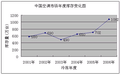 库存方面,2005年度空调行业的库存量为702万台,工业库存和渠道库存都相对保持在高位,这在很大程度上使得工厂的排产计划受到影响,加之2006年淡季渠道出货和终端销售都不是很理想,结果自然造成2006年旺季时库存量快速上升,最高超过1300万台。经过旺季的库存消化,到2006冷冻年度结束,工厂和商家的库存总量依然超过1000万台,创造了历史上的最高峰值,07冷冻年度的消化压力急剧加大。