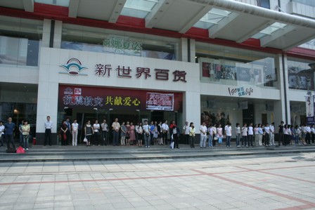 灾难发生以来,那些残壁废墟,那些鲜血淋漓,无不让人鼻头发酸,心头发沉。面对亡魂,面对悲泣的天空和大地,新世界百货长沙店从14点28分至31分,将停止一切营运活动,停止店堂音乐,所有员工和顾客一起默哀3分钟,表达对受难同胞的哀悼之情。