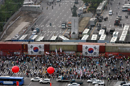 60个大型集装箱设置了路障。报道称,以来此次为应对示威而设置集装箱阻断墙是自2005年11月釜山APEC(亚太经济合作组织)首脑峰会后,时隔三年后的第一次,对首尔而言更属首次。警方相关人士介绍称:“迄今为止,用警车设置了车墙,但经常被示威队推开或被破坏。一旦示威队和警方发生冲突,很有可能造成安全事故,因此为避免肢体冲突,用集装箱设置了路障。”