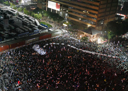 10日晚8点过后,“6•10”烛光集会参加人数在不断增加。示威群众挤满了从世宗路十字路口到太平路、南大门的主干大道,一起合唱“民运歌谣”《清晨甘露》、《大韩民国宪法第一条》,高喊着“重新进行谈判,撤销告示”、“审判李明博”等口号。