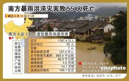 6月6日以来,浙江、安徽、江西、湖北、湖南、广东、广西、贵州、云南等南方9省(自治区)遭受暴雨洪涝灾害。截至6月14日21时统计,共造成1787.4万人受灾,因灾死亡55人,失踪7人,紧急转移安置127.4万人;农作物受灾面积860.5千公顷,绝收面积90.2千公顷;倒塌房屋4.5万间,损坏房屋14.1万间;直接经济损失106.1亿元。针对广西、江西、湖南、广东灾情发展情况,根据《国家自然灾害救助应急预案》,国家减灾委、民政部于6月14日20时分别对四省紧急启动国家三级救灾应急响应,并派出工作组赶赴灾区,协助地方开展抗灾救灾工作。中新社发徐彩霄 摄