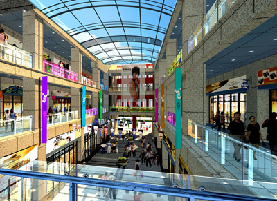 商业建筑由内街、外街及多个大型临街广场组成,内街中庭面积达