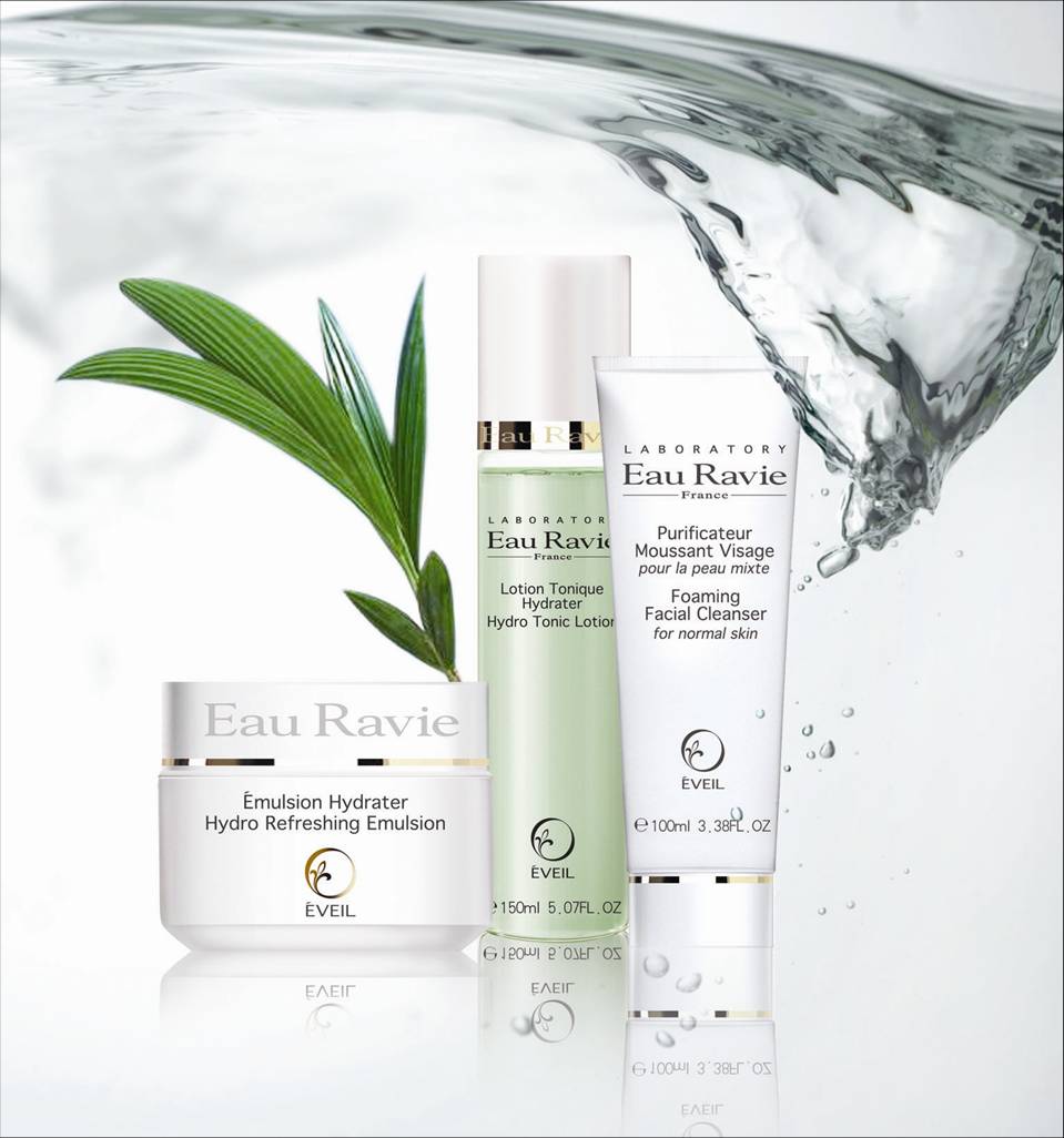 在法语里,“EAU” 代表清澈、纯净的生命水能量;“RAVIE”更被描绘成肌肤回归健康和生命力的美