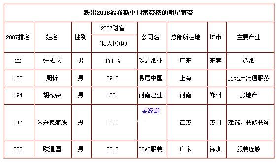 跌出2008福布斯中国富豪榜的明星富豪(表)