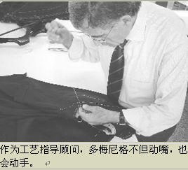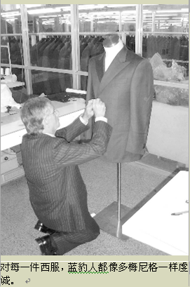 为了赋予“蓝豹”以灵魂,今年73岁的多梅尼格已奋斗了8年。多梅尼格是吴建卫六顾意大利花重金请来的世界著名的服装工艺大师,这是一个富有传奇色彩的人物,从业超过半个世纪的他相继为PRADA、ZEGNA、GIORGIO ARMANI、CK等国际大牌服务。2000年,在再三思量之后,多梅尼格终于同意出任“蓝豹”工艺指导顾问,此后每年都到常州工作一段时间,进行现场工艺指导,打磨“蓝豹”的细节。