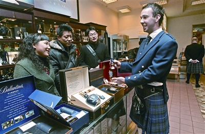 昨日在汉口解放大道某大型商场,一名身穿苏格兰民族服装的洋酒推销师正在为中国顾客介绍产品。由于受金融危机影响,许多外国酒类公司业务萎缩。于是他们想借中国的农历新年提高销量,纷纷派员工来中国力推自己的产品。