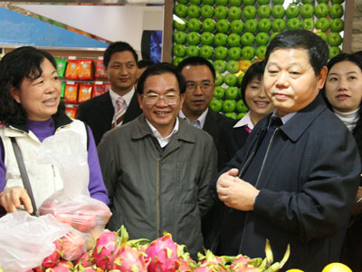 在水果区,许市长与正在挑选水果的顾客亲切交谈:“方不方便,满意吗?价格合理吗?”一边说一边亲切地与顾客握手。在雪莲果的堆头前,许市长拿起来一个,饶有兴致地向大家介绍:“这种食品能够促消化,调节肠道,增强人体代谢功能;还能调理血液,降低血脂,有效地控制胆固醇和糖尿病;经常食用,能增强免疫力。来——给大家带个头,我们也拉动拉动内需,马上秤重买单,各