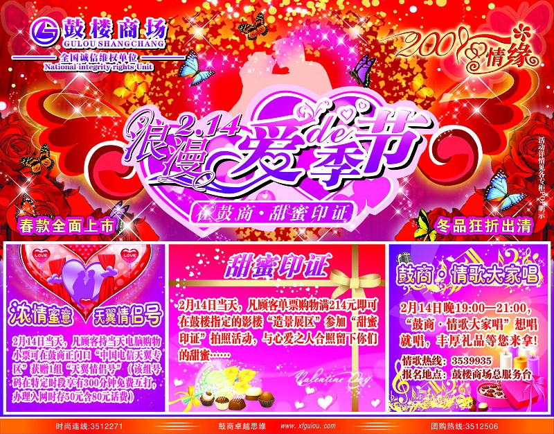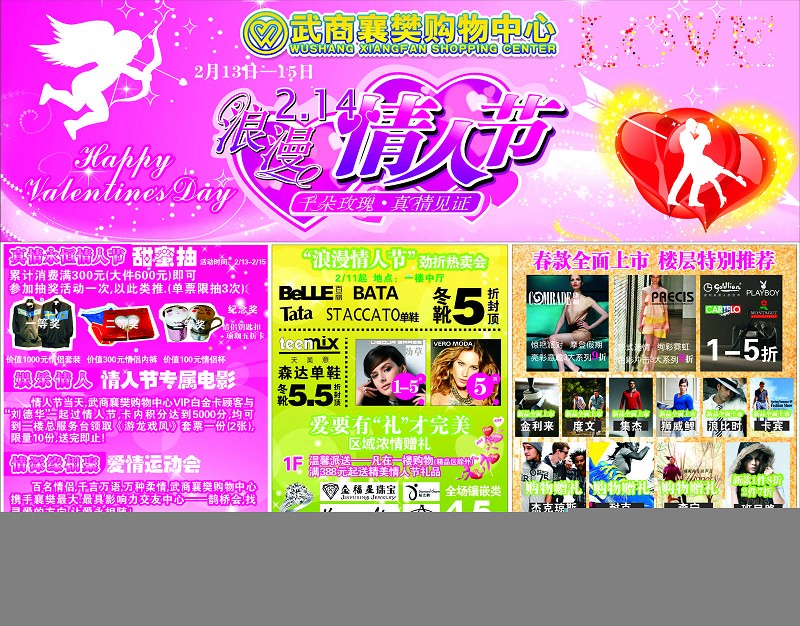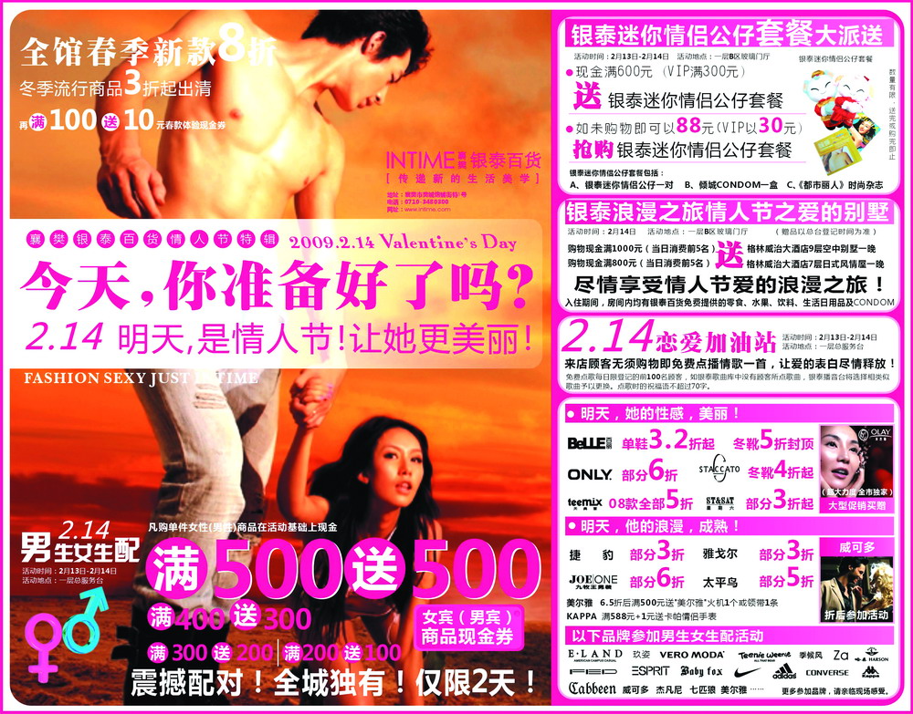春款8折的活动力度几家店的差不多,辅助的满500送500、满400送300、满300送200、满200送100才是主力。由于是情人节,本档送券活动与普通满送的区别在于全馆商品均区别了男宾柜和女宾柜,分别贴了不同的标识。满女性商品只能送男宾券用于男装、男鞋、男式用品等;同理,买男性商品只能送女宾券用于女装、女鞋、化妆品等女性商品专柜。刻意的流程对4F男装销售有了较大带动,销售比平日增长10倍,效果明显。全馆活动参加率达到90%。包括ELAND、TEENIEWEENIE、NIKE、ADIDAS、ONLY等品牌均参加了活动。商场让利较多,由于理论损失率在35%-50%之间,故只要谈判综合扣率高于理论损失率即可,商场主要通过边角余料及2%促销费赚取利润。