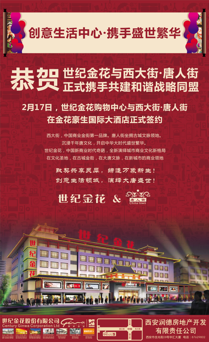 2月17日,西大街·唐人街与世纪金花股份有限公司在世纪金花豪生国际大酒店正式签约,双方携手着力打造的世纪金花创意生活中心即将成为西大街上新型的商业亮点。