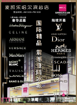 麦凯乐哈尔滨总店即将强势启幕! 筹备多年的麦凯乐哈尔滨总店,在经过将近8个月的试营业,即将强势开幕。 开幕后的麦凯乐哈尔滨总店(目前的品牌布局,日后会调整)将是中国东北地区最好的四家商场之一,也是哈尔滨最高档的商场,相对哈尔滨原有的新世界、金安、松雷三家中高档商场,品牌档次有了大幅度的提升,是哈尔滨第一家按照国际奢侈品牌要求设计楼体布局的商场,对于哈尔滨的商业现代化有着里程碑式的意义。 LV(黑龙江第一家、首席执行官贾世杰宣布哈尔滨店为全球最新形象店)、DiorI(黑龙江第一家、男装、女装)、Hermes(黑龙江第一家)、Ermengildo Zegna(黑龙江旗舰店)、Salvatore Ferragamo(黑龙江旗舰店)、Celin(黑龙江第一家)、Versace(黑龙江第一家)、Armani Collezioni(黑龙江第一家)、Etro(黑龙江第一家)、HUGO BOSS、DUNHILL、TRUSSADI、Swarovski、Montblanc、Max Mara、Lancel(黑龙江第一家)、Escadaa、威世顿、米索尼等。