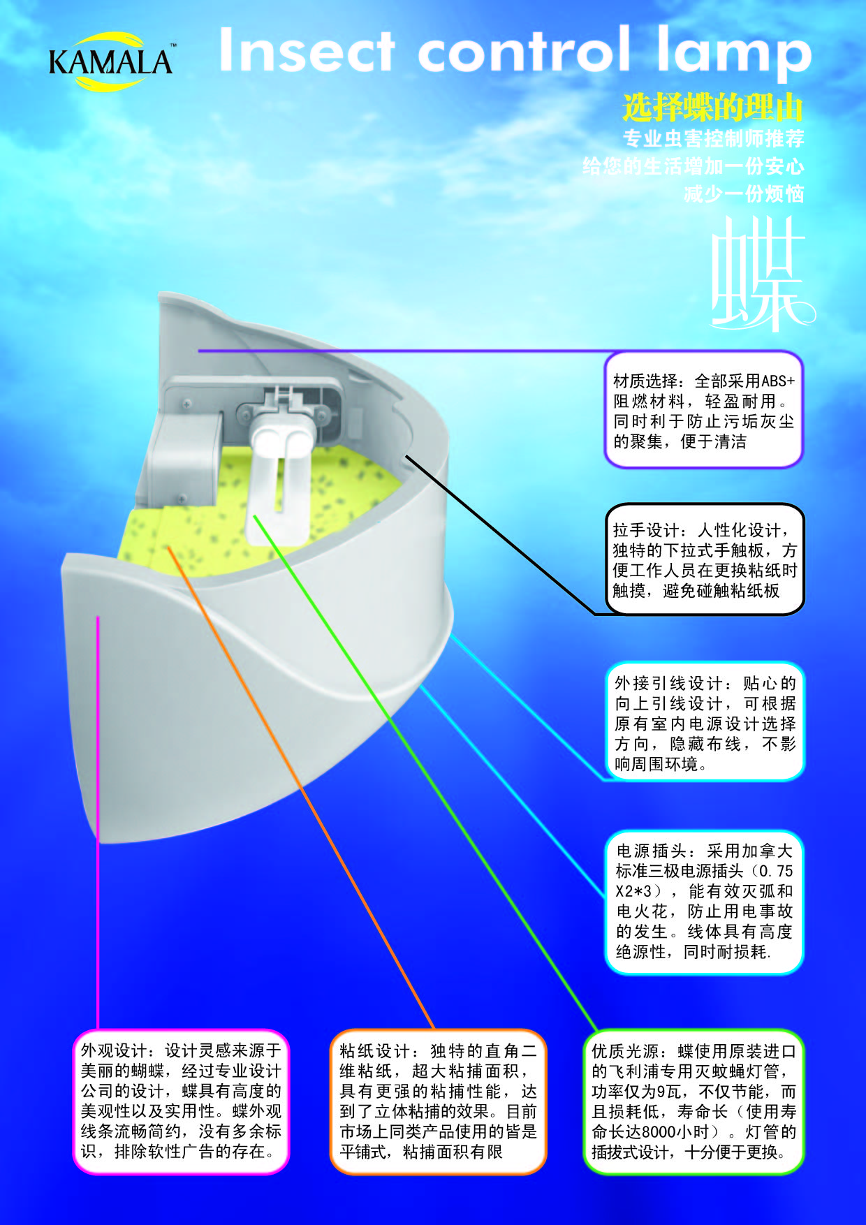 1、独特的ABS+阻燃材料的选用,使苍蝇等飞虫控制变得更容易,更环保。