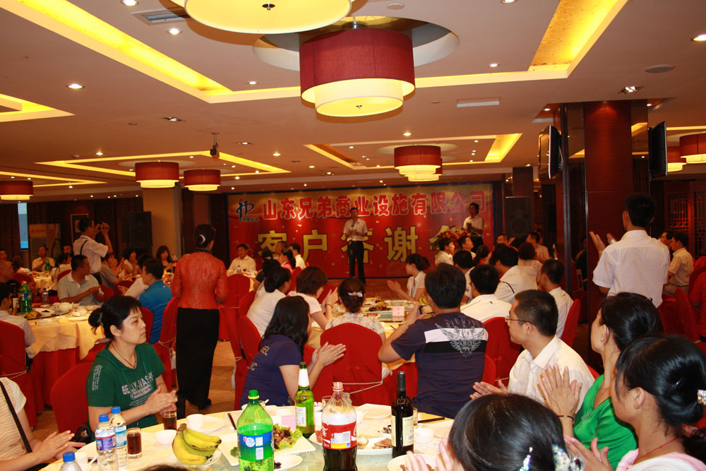 此次会议为期三天,深得与会人员的一致好评。山东兄弟商业设施有限公司并于25日晚在丽景广场酒店宴会厅举行了答谢晚宴。晚宴由兄弟公司总经理刘涛致祝酒词,当地政府相关领导出席此次宴会并发表重要讲话。山东兄弟商业设施有限公司安排了相声、杂技、歌舞等精彩文艺节目,此次活动增进了客户之间彼此的了解,加深了客户与兄弟公司之间的合作关系,利于更长久的合作。