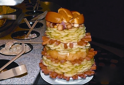 记者在百度输入“必胜客自助沙拉”,出现帖子10多万篇,其中大多是关于堆砌沙拉塔的技巧。在“得意生活”等武汉生活论坛上,高手们发布的自助沙拉堆砌攻略、秘笈比比皆是,用胡萝卜当“钢筋”,用菠萝块做“承重墙”,用葡萄干填补缝隙……不少人还在网上“晒”出沙拉塔图片。