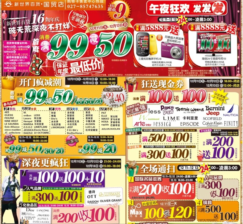 新世界百货国贸店宣称,11日开始到13日,打算熬到凌晨三点再打烊,除了“99减50”的折扣外,深夜时段满100送100,爱慕等品牌全场20元起,号称力度超过历年圣诞夜。凌晨零点起,满额再送三星触屏最新款手机、26寸液晶电视等。为“养精蓄锐”,该商场周五、周六两天的开门时间,也调整到了中午12点。