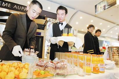 昨日,汉口航空路一家商场内,几名服务员正在为顾客送点心、饮料。据悉,这种新的服务方式是来自一种新的餐饮行当。他们主要是针对店庆、开业、小酒会,为参与者准备食物。他们一般没有固定餐饮经营场所,专为需要者上门服务。