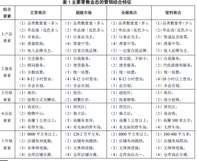 零售业态营销组合特征分析 我们根据各种零售业态的普及率和在零售市场上的占有率,选择百货商店、超级市场、仓储商店和便利商店4 种业态进行分析。通过比较美国、法国、日本和中国对于这4 种零售业态营销组合特征,我们发现4 种零售业态在4国有一个共同的特征,即它们的不同表现都是通过6个基本营销组合要素的22 个具体维度实现 主要零售业态的营销组合特征 组合要素 百货商店 超级市场 仓储商店 便利商店 1.产品要素 (1)品类数量宽(多); (2)单品深(花色多); (3)非食品; (4)质量较高; (5)他人品牌为主。 (1)品类数量宽(多); (2)单品深(花色多); (3)以食品为主; (4)质量中等; (5)注重自我品牌。 (1)品类数量宽(多); (2)单品浅(花色少); (3)以食品为主; (4)质量中等; (5)一定量自我品牌。 (1)品类数量窄(少); (2)单品浅(花色少); (3)快速品及饭菜; (4)质量中等; (5)他人品牌为主。 2.服务要素 (1)完全服务; (2)顾问服务; (3)分散结算; (4)8-12小时营业; (5)非会员制。 (1)自我服务; (2)理货服务; (3)统一结算; (4)8-12小时营业; (5)非会员制。 (1)货自提,不刷卡; (2)理货服务; (3)统一结算; (4)8-12小时营业; (5)会员制。 (1)自我服务; (2)代收款便利服务; (3)统一结算; (4)16小时以上营业; (5)非会员制。 3.价格要素 (1)高价; (2)促销方式为酬宾。 (1)低价; (2)频繁打折。 (1)超低价; (2)批量销售。 (1)高价; (2)很少促销。 4.店址要素 (1)商业区; (2)购物中心; (3)商圈5公里以上; (4)有停车场。 (1)居民区; (2)独立店; (3)商圈有差异; (4)有充裕的停车场。 (1)居民区; (2)独立店; (3)商圈5公里以上; (4)有充裕的停车场。 (1)居民区; (2)商业街; (3)商圈500米左右; (4)无停车场。 5.环境要素 (1)6000平方米以上; (2)店铺布局宽敞; (3)有休闲设施; (4)仓库店铺分离。 (1)120-2万平方米; (2)店铺布局拥挤; (3)无休闲设施; (4)仓库店铺分离。 (1)6000平方米以上; (2)店铺布局拥挤; (3)无休闲设施; (4)仓库商店合一。 (1)100-400平方米; (2)店铺布局简洁; (3)无休闲设施; (4)仓库商店分离。