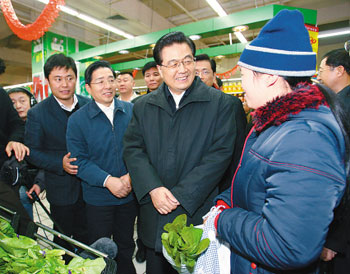2008年2月5日至8日,中共中央总书记、国家主席、中央军委主席胡锦涛在自治区党委书记、自治区人大常委会主任郭声琨,自治区党委副书记、自治区主席马飚等陪同下在广西考察工作。图为胡锦涛在桂林市南城百货超市了解市场供应情况。