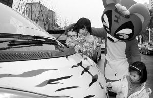 以老虎为主题的装饰为上海增添了浓浓的年味。卡通小老虎观看小朋友涂鸦“虎”面汽车。  年末促销,商家推出优惠举措吸引消费者。